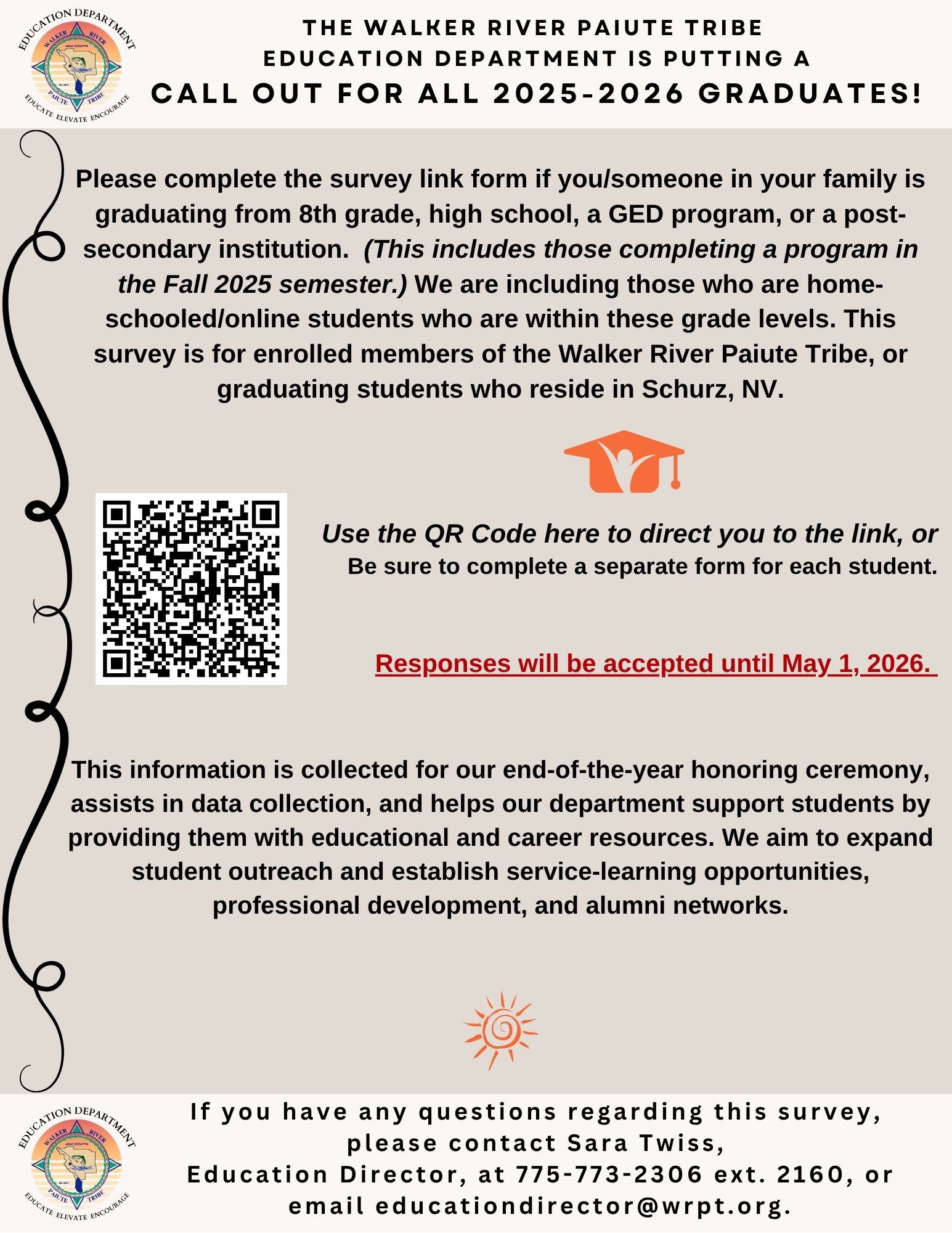 The Higher Education Grant is a financial program based on the need to provide educational opportunities for Walker River Paiute Tribal members to attend a higher education institution. The program’s funding criteria are based on the Walker River Paiute Tribe’s annual funding agreement with the Bureau of Indian Affairs (BIA). This program is designed to offer support and guidance in attaining a higher education. Students must be entering or continuing with their post-secondary education at the undergraduate level and require financial support. Please carefully read through the policies and procedures before applying. Applications are accepted by mail, email, and fax.